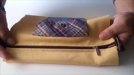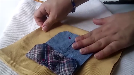 Ahora doblamos la tela por la mitad con la parte del derecho hacia arriba y posicionamos el bolsillo al que fijaremos a la tela con alfileres para luego coser por todo el borde procurando no coser la solapa.