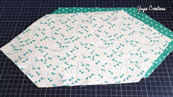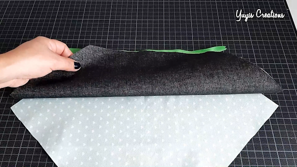 Luego colocamos la entretela por el lado del revés de la tela exterior y planchamos sin vapor. Una vez que la entretela esté pegada, colocamos la cremallera en el borde superior y encima la pieza del forro con el derecho hacia abajo, así: