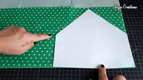 Vamos a utilizar el molde para cortar la tela. La tela la doblamos de forma que nos quede una medida de 20x20 cm. Colocamos el molde con la parte de los 20 cm en el doblez de la tela, así como ves en la imagen de abajo.