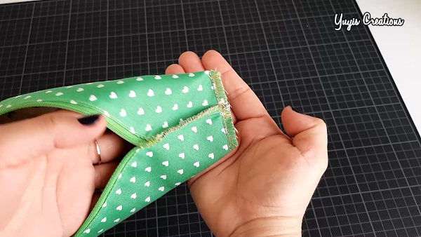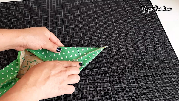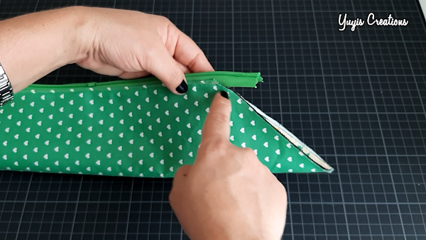 Ahora, vamos a hacer el fondo del estuche de la siguiente forma: Abrimos el estuche así como ves en la imagen de abajo, centramos la costura y a los 7 cm desde la punta, marcamos una línea recta para guiarnos al momento de coser. Y cosemos por esa línea haciendo puntadas de refuerzo al inicio y al final. Lo mismo haremos con el otro lado.
