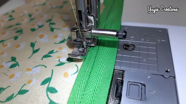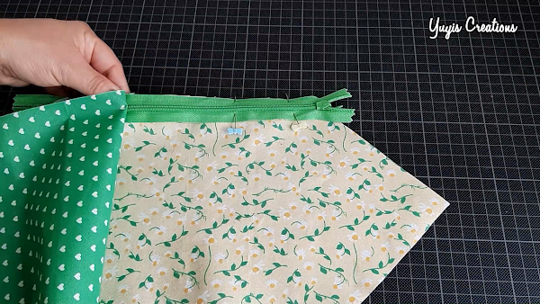 Llevamos cada pieza de tela hacia el borde libre de la cremallera: la tela del exterior por un lado y la tela del forro por el otro lado, sin olvidar abrir la cremallera más o menos a la mitad, tal como te muestro en la imagen de abajo.