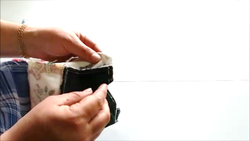 Pasamos ahora a hacerle la base al estuche, para esto vamos a meter la mano por la abertura y vamos a sacar las esquinas formando un triángulo y haciendo coincidir las costuras, así: