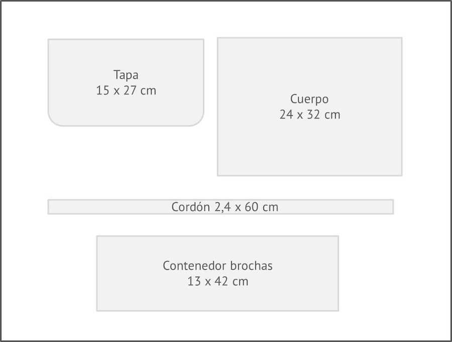 Para que te hagas una idea de la tela que vas a necesitar, aquí tienes las medidas de todas las partes del estuche porta brochas: