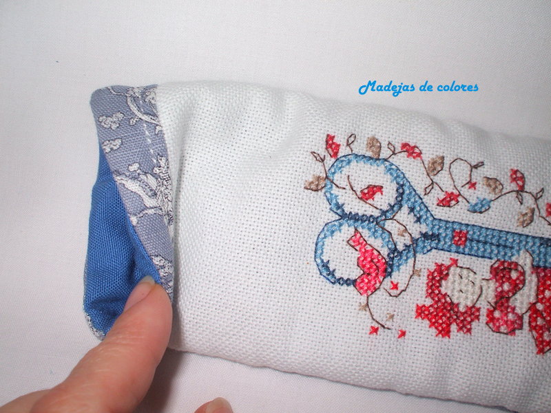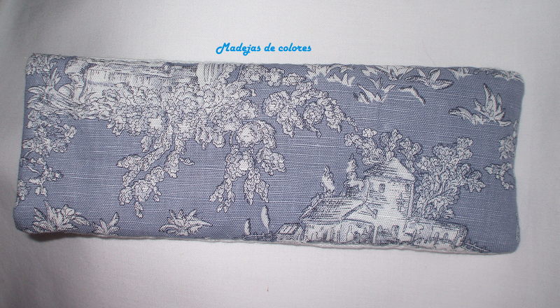 La trasera y franja superior, la hice con una tela azul que combina muy bien y que me recuerda a la vajilla de la Cartuja.