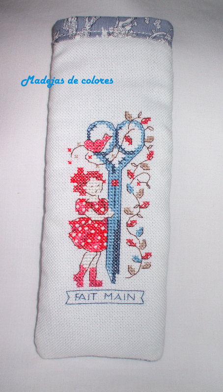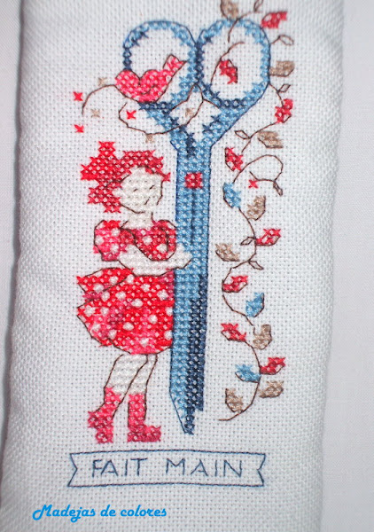 Se trata de una muñeca con unas tijeras, sacada de una revista "Création Ponint de Croix" tiene unos motivos preciosos y delicados.
