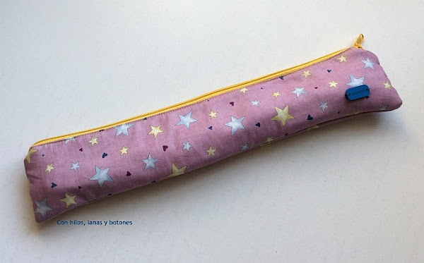 Queríamos el estuche alegre, así que escogimos una cremallera amarilla para darle más color y un botón de madera de esos que ponen handmade en azul. Por colores que no sea.