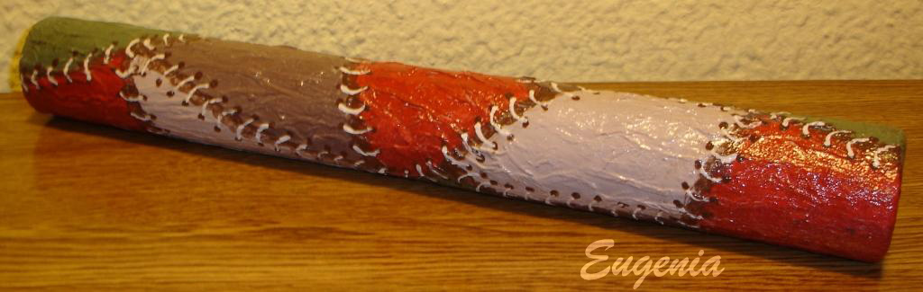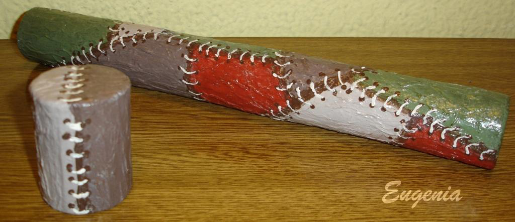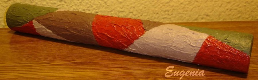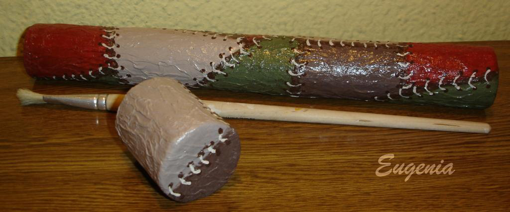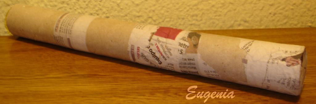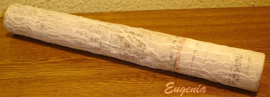 Cogemos tres tubos de papel higiénico y los unimos pegando trozos de periódico con cola. Cortamos un cartón a medida para la base y luego vamos pegando varias capas de periódico, dejando secar bien y lijando entre capas para que quede todo igualado, hasta que tenga la dureza que queramos.