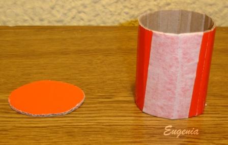 Para hacer la tapa del estuche damos forma redonda a un cartón midiendo alrededor del tubo que hemos hecho, cortamos un círculo y hacemos lo mismo de antes: varias capas de periódico, papel de cocina, pintura y los cosidos.