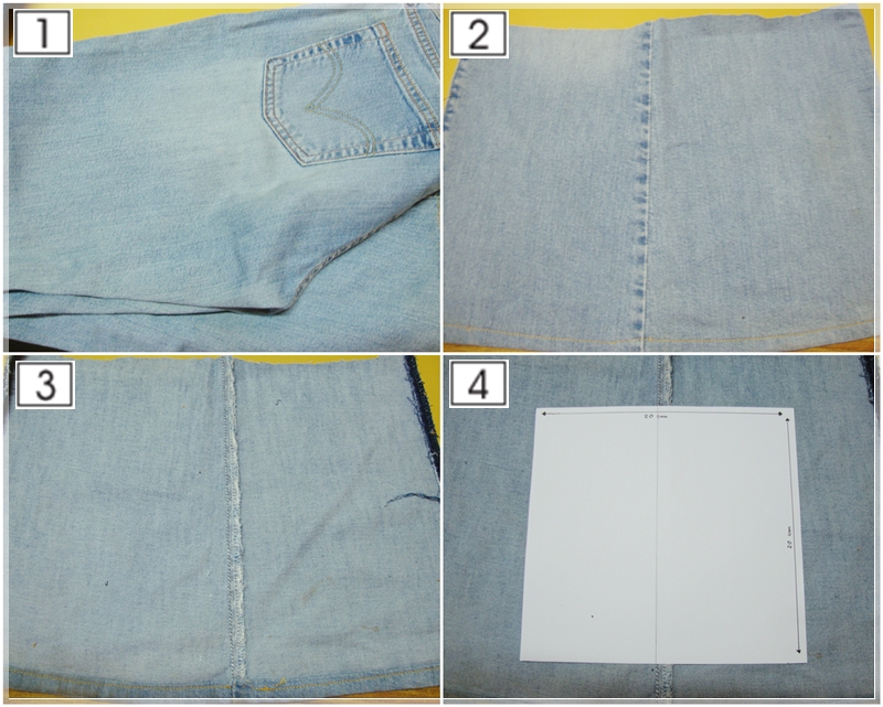 Paso 2. Pasar el patrón a las telas. Una vez tenemos el patrón lo tenemos que pasar a las telas escogidas para nuestro estuche, uno en la tela vaquera que será la tela exterior de nuestro estuche y otro en la tela estampada que será el interior de nuestro estuche. Escogemos de nuestro pantalón la zona que nos guste más (imagen 1), en nuestro caso la parte baja de la pierna (imágenes 2 y 3), de la que descosimos un lado e hicimos coincidir la mitad de nuestro patrón con la costura del pantalón que no descosimos (imagen 4).
