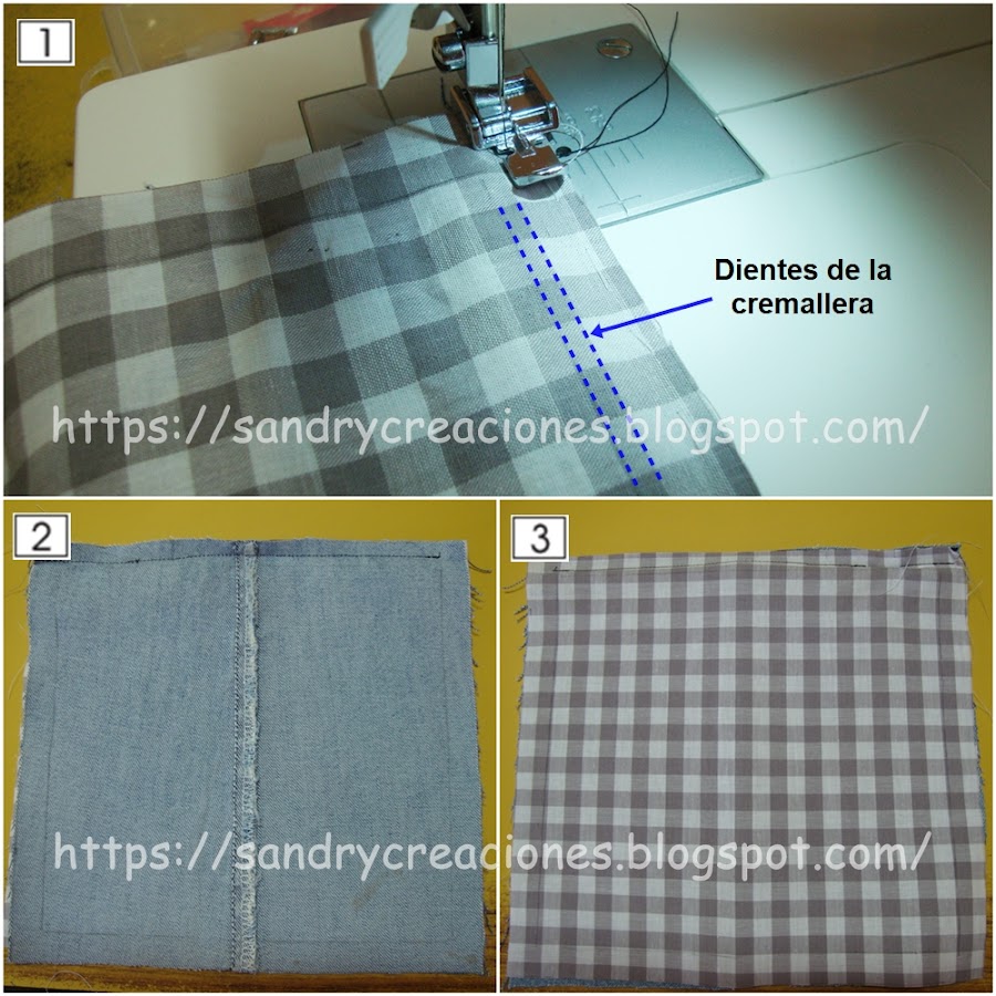 Una vez tenemos las tres piezas colocadas correctamente nos vamos a coserlas a máquina (si no tenéis también podéis hacerlo a mano). Para que no se nos muevan las piezas a la hora de coserlo a mano o a máquina las sujetamos con alfileres o si nos es más cómodo para trabajar podemos hacer un embaste. Ahora si, cosemos con el pie de cremallera justo después, más o menos a 1 o 2 mm, de dónde palpamos con las manos los dientes de cremallera (imagen 1), quedándonos las telas cosidas por un lado y por el otro de la forma que vemos en las imágenes 2 y 3.