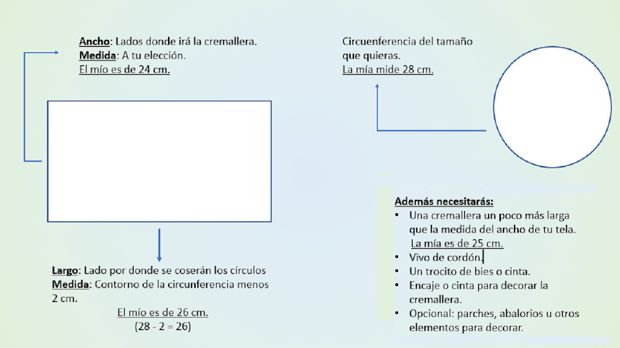 1 pieza de tela rectangular para el exterior y 1 para el forro con las medidas que te muestro abajo en el esquema.