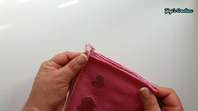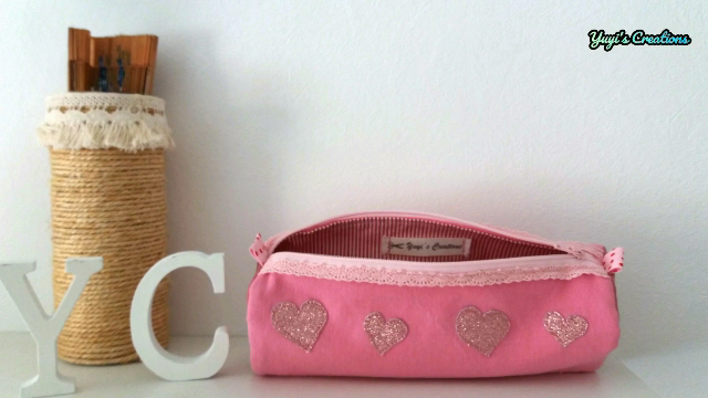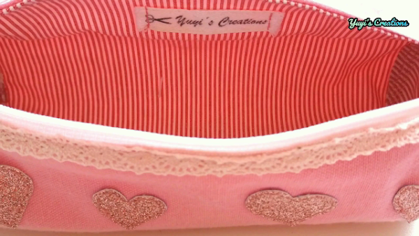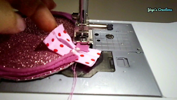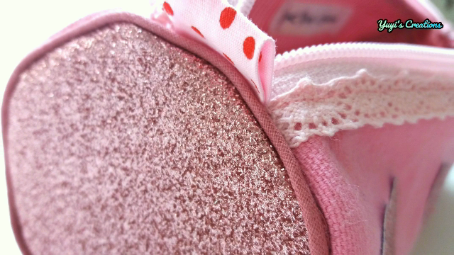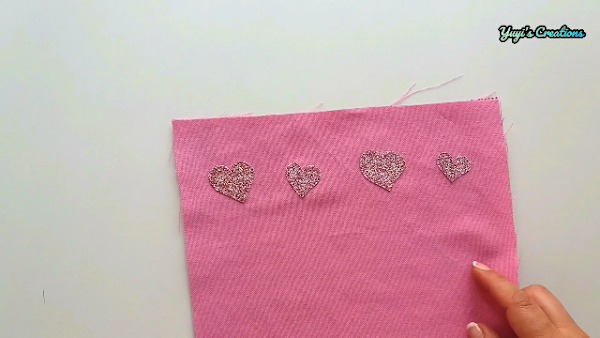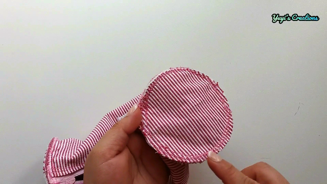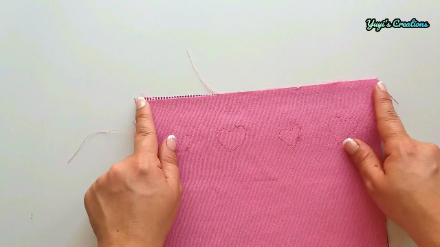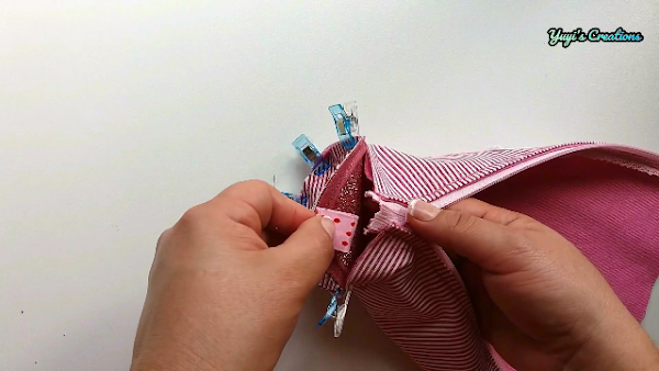 Vamos con las piezas de tela rectangulares. Yo por mi parte le he colocado a mi tela exterior unos paliques que hice con la misma tela de la circunferencias, he hecho esto porque mi tela es unicolor y quería darle un poco de alegría. Además aproveché para coser también una etiqueta por el lado del forro.