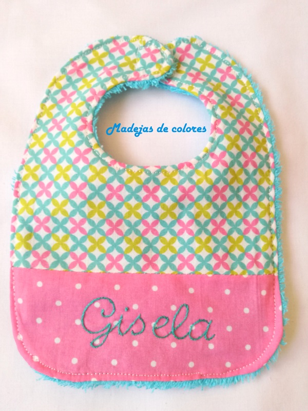 Recuerdan hace unas semanas que les mostraba una canastilla de niña? La pueden ver aquí. Pues ya tiene dueña y como detalle le añadí este alegre babero con el nombre de la pequeña bordado en punto tallo.