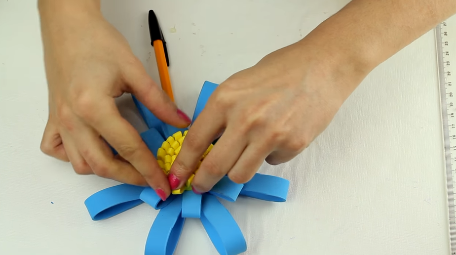 - A continuación corta unas tiras azules y crea con todas ellas una flor. Haz lo mismo con la goma eva en color amarillo, pero esta vez para crear el centro de la planta. Como en las fotos: