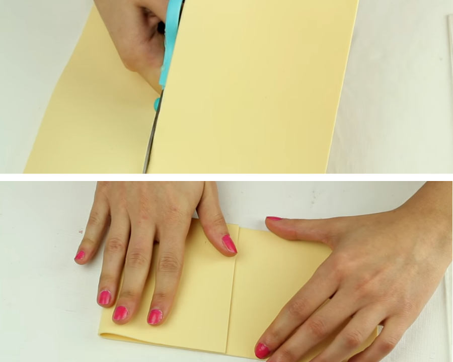 - Mide y corta la goma eva con las medidas que quieras para tu estuche. Luego dobla y pega su parte inferior, de modo que quede así: