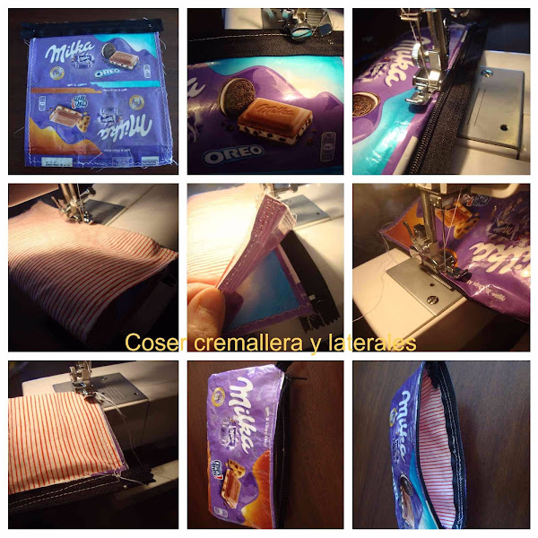 Después pasamos a coser la cremallera, no desesperéis que pasito a pasito se puede. Una la hice a máquina y otra a mano, siguiendo los mismos pasos de las fotos. Las puntadas a mano no serán tan rectas pero quedan divertidas.