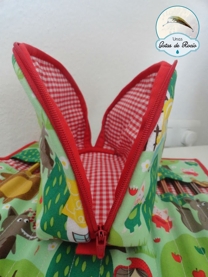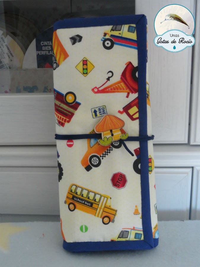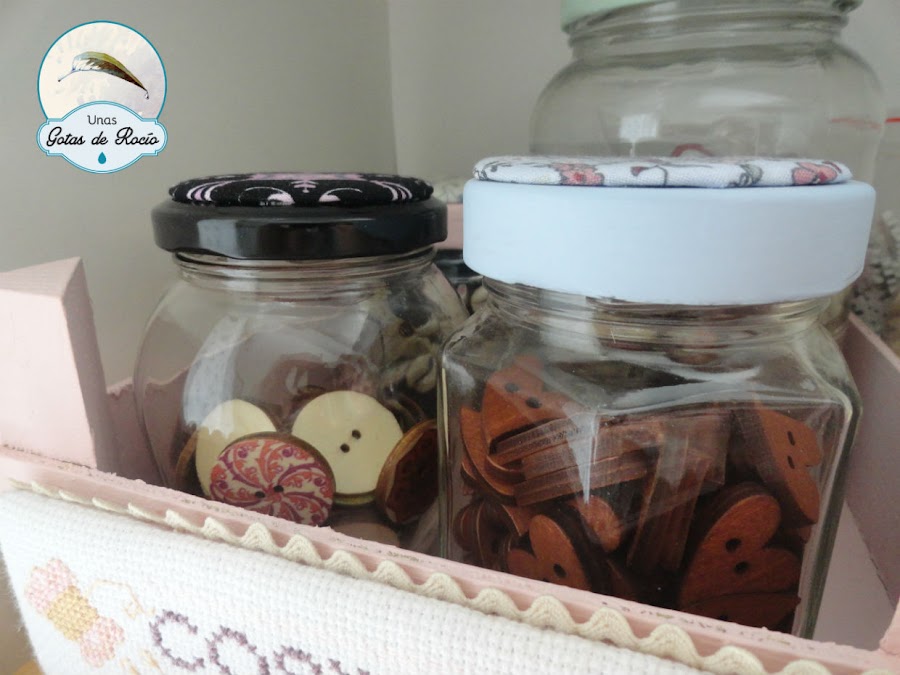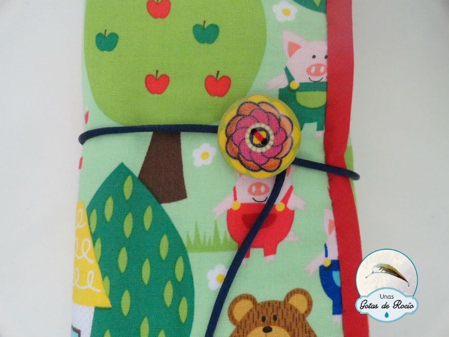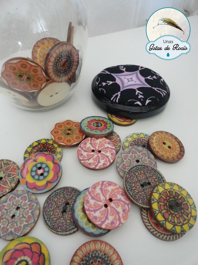 A este estuche con tela de cuentos, le puse un precioso botón de una colección de botones mandala que me compré este verano. A los cuales les he preparado un botecito donde guardarlos.