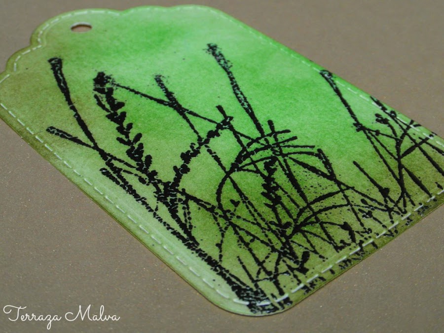 En la capa inferior de la etiqueta he embosado un fondo de campo de hierbas y he coloreado con tintas distress.