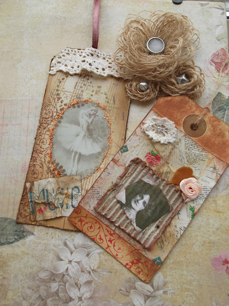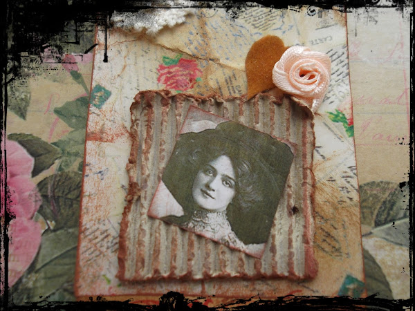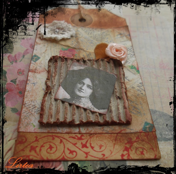 Se trata de una etiqueta que he realizado con distintos restos de materiales que he ido guardando, cartón corrugado,flores de raso, fieltro, algún que otro sello y una imagen impresa sacada de la red.