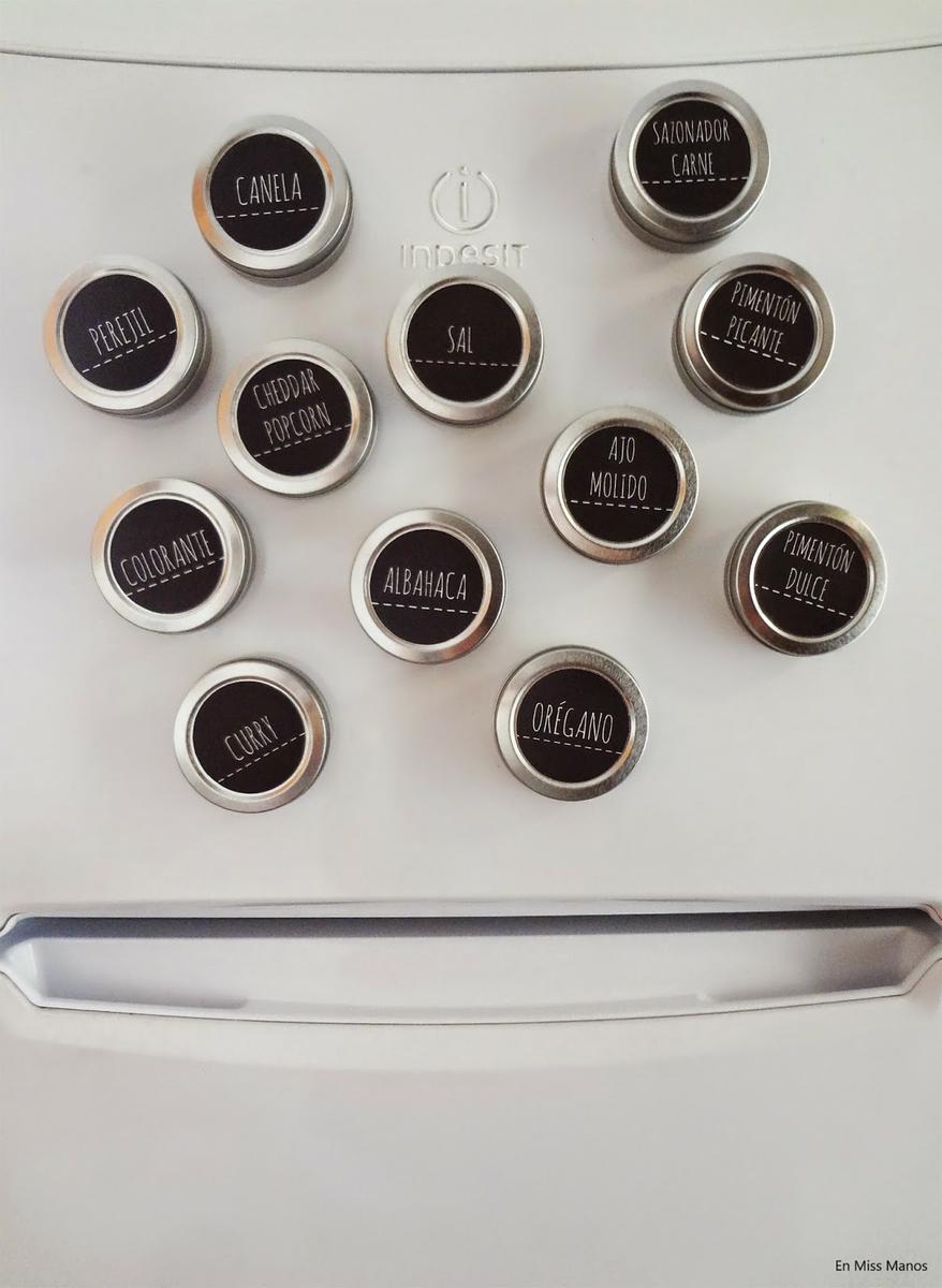 Mi primer intento fue hacer un soporte con imán y una madera para éstos especieros, pero los imanes no soportaron el peso, y a la nevera tuvieron que ir a parar.