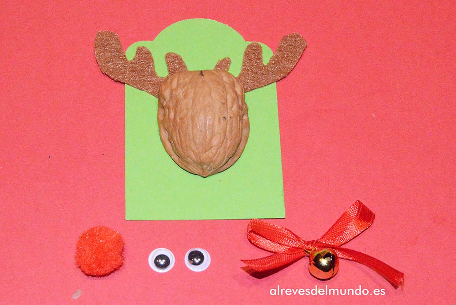 - Pegamos la cascara a la cartulina y encima pegamos los ojos, el pompón y el lazo con el cascabel