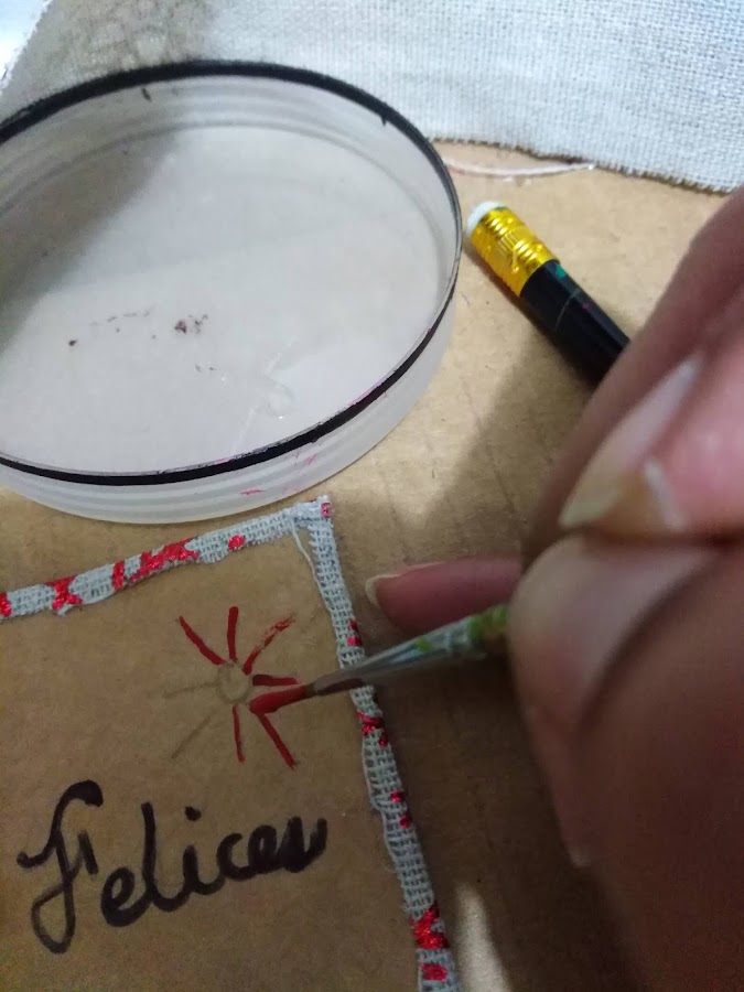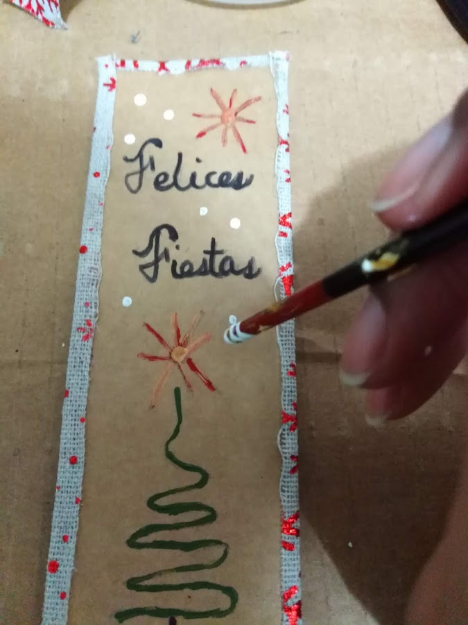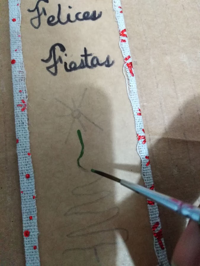 Ya con la cinta bordeando el cartón, en la parte que no esta forrada le he dibujado detallitos navideños con el mensaje de felices fiestas, este es mi opción, pero igual puede ser personalizado o con oro mensaje, etc....o solo el dibujo. La idea esta abierta a varias opciones