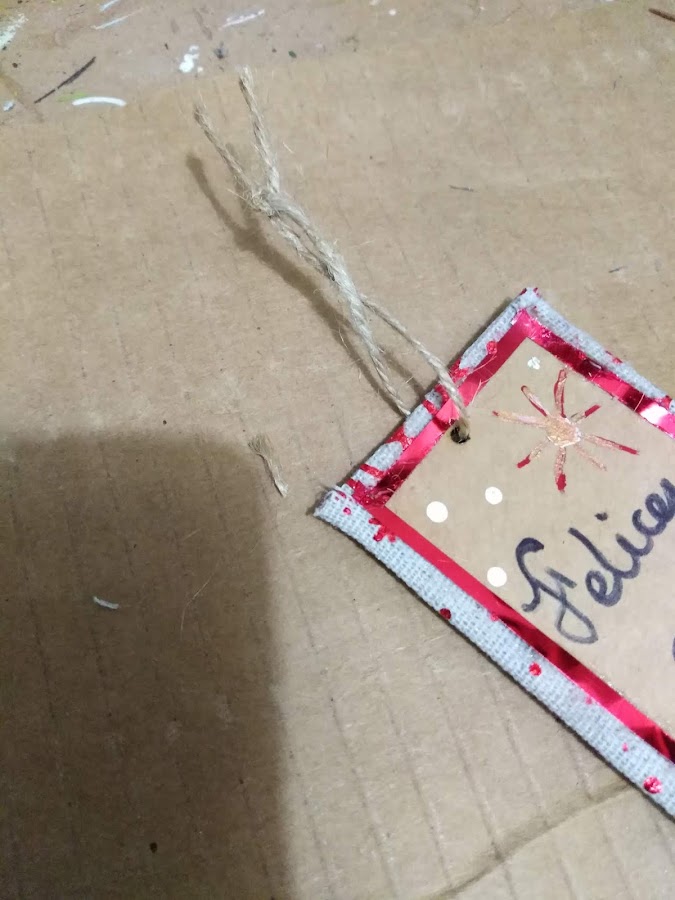 Gracias a Dios que vivo guardando cosas con la excusa de que algún día lo necesitaré, me regalaron algo que no recuerdo que??? y vino en una caja con todos estos flecos rojos brillantes que ahora los usé para el borde de la etiqueta, que les parece??