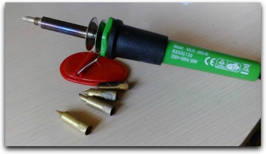 Habéis hecho algún trabajo con la técnica del pirograbado? Yo hace un tiempo, chafardeando por la red, descubría está técnica de quemar sobre madera artísticamente, y me enamoré!! como no hay nada, nada, que me quede sin probar, en cuanto tuve oportunidad me encaminé a un centro de bricolaje (de cuyo nombre no voy a hacer publicidad), y me agencié con este pirograbador. Es el mas sencillo que hay, y viene con puntas de medidas y formas diferentes. Me costó unos 13.