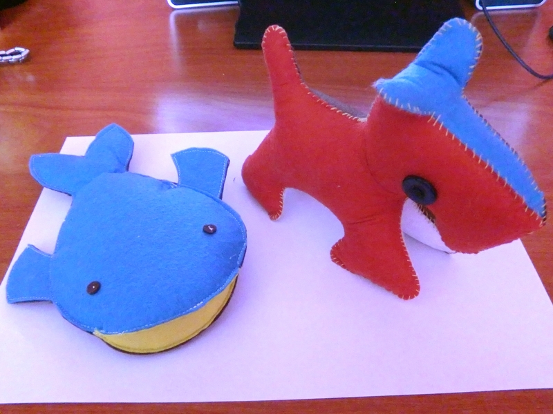 Aquí os dejo unas fotos de la ballena y del perrito multicolores que cosí (la ballena está a máquina y el perrito a mano).