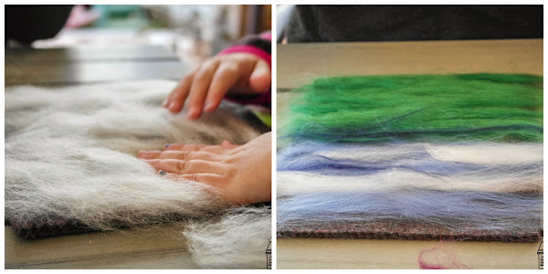 (2) Colocamos los mechones de lana sobre la alfombrilla, formando nuestra composición