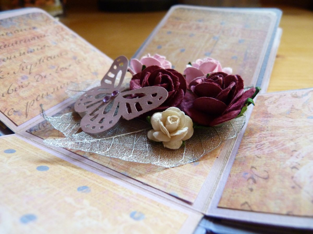 Un par de fotos del interior, hojas plateadas, un ramillete de flores y un troquel de mariposa de Marta Stewart, regalo de Rafi.
