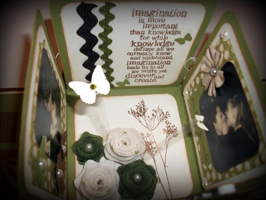 He usado papeles de varias colecciones en tonos verdes y marrones, y para el exterior una carpeta de embossing que adquirí hace poco y que me encanta.