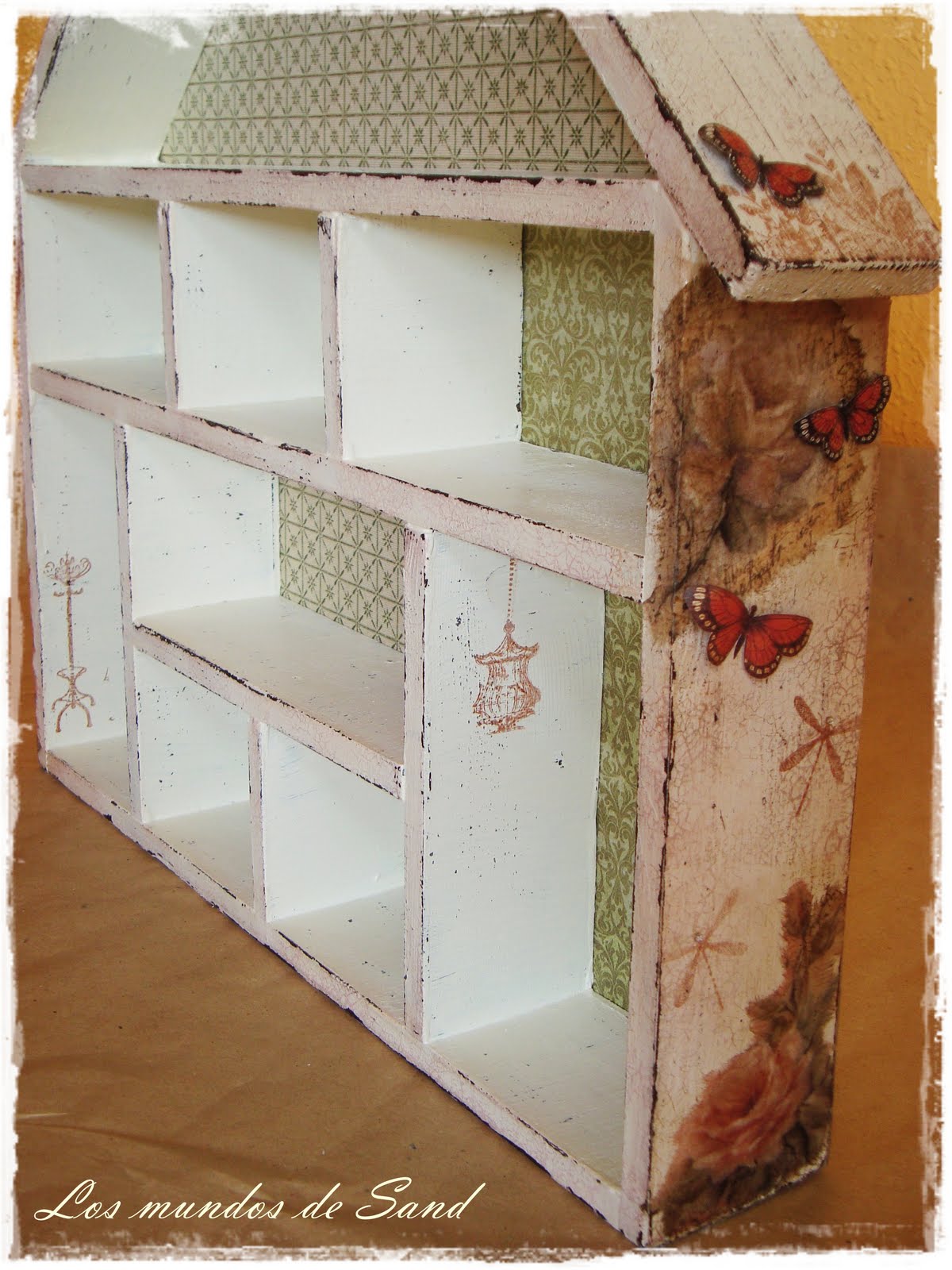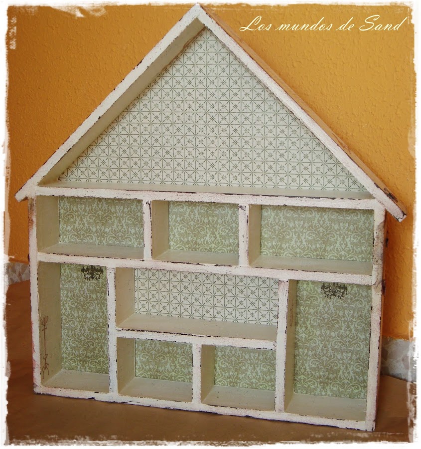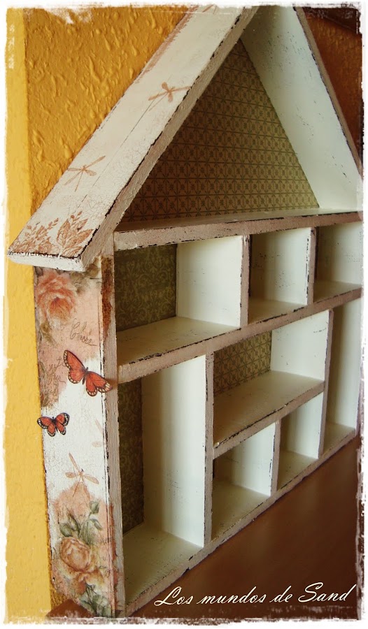 Y así me quedó una preciosa casita blanca antigua que ya podría haberla dejado así. Pero como mi mente es de una scrapera sin remedio, pues !!a tapar todo hueco que tenía por los lados!! Para ello estuve entre scrapear o decoupagear, y al final un poquito de cada. Mi idea era poner unos motivos de decoupage de hadas, pero claro, las haditas todas brillantes y la casa de lo más vintage, pues no pegaba. Así que al final le pusimos unos motivos florales, que como no, tenían que ir acompañados de mariposas, y un desvarío de sellos primaverales de escándalo...