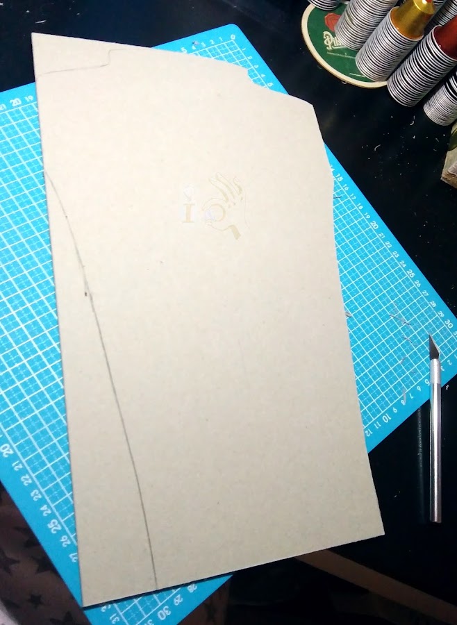 Comenzamos con un cartón piedra, yo uso uno de 3mm para que tenga consistencia, y en un folio doblado dibujamos la mitad de la forma que queremos que tenga el cuello en cuestión. Como yo de vez en cuando hago collares con cierta largura voy a hacerlo bastante largo, pero por lo que he visto lo normal es que tengan 20cm o a lo sumo 30cm de largo.