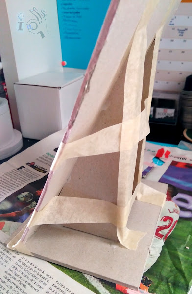 Luego llega el momento de ponerlo en pie. Recorto una base rectangular del mismo ancho que la base del expositor, y dos triángulos iguales entre sí con el ángulo de inclinación que le quiera dar al expositor. De estas piezas no tengo foto, pero creo que con las siguientes lo vais a entender. Las encolo con cola de carpintero, lo sujeto con cinta de carrocero y lo dejo secar bien.