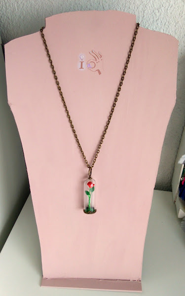 Aquí lo veis con el colgante de la rosa que hice para el reto de miniaturas pero no pude acabar de montar porque me faltaba la cadena. Así lo podéis ver acabado del todo.