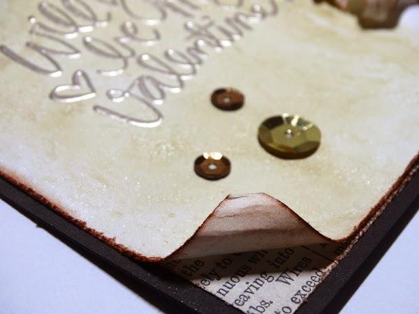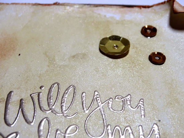 He estrenado el gelato para hacer un fondo en una cartulina blanca y le he rasgado los bordes y después entintado con distress. He usado el sentimiento principal del set de sellos, que luego he embossado en un tono medio dorado. Le he puesto unas lentejuelas doradas y marrones y ale, tarjeta hecha!