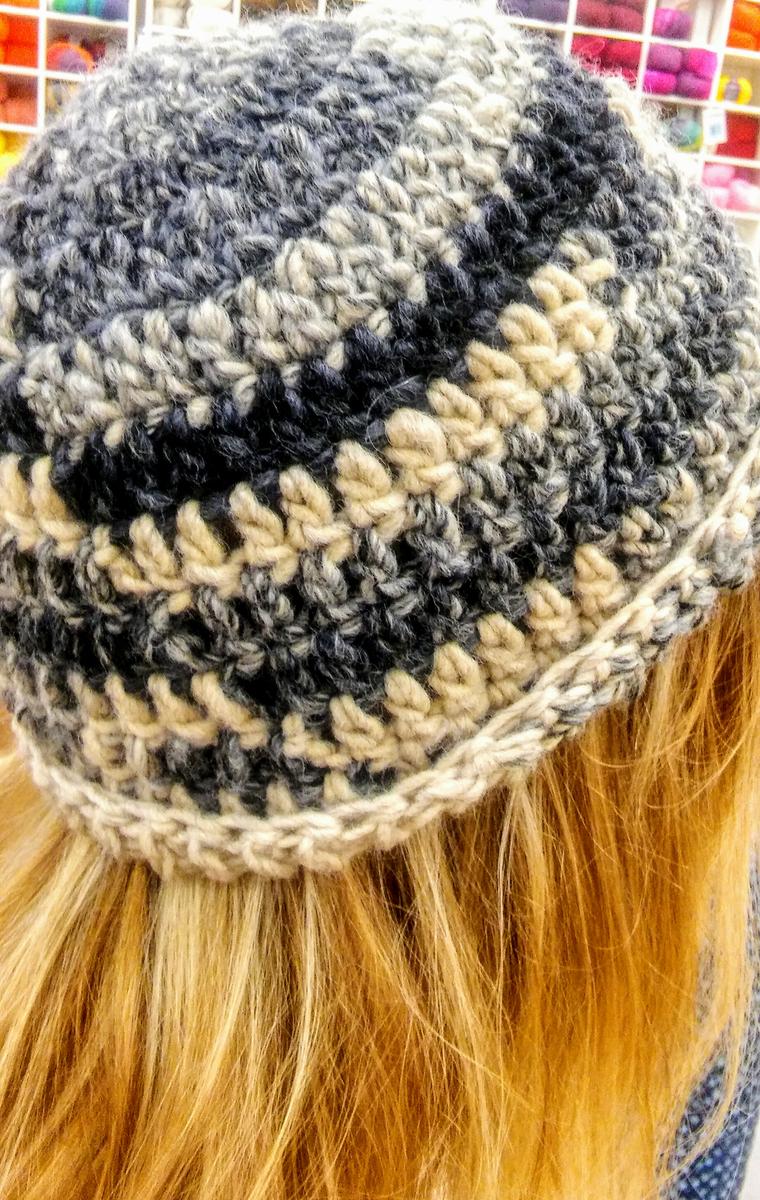Unos gorros los hice con lana Azteca o Merino de lanas Katia , otros con Noruega o Belt de lanas Stop , otros con lana Mondial . En definitiva que fui probando distintas lanas gruesas .