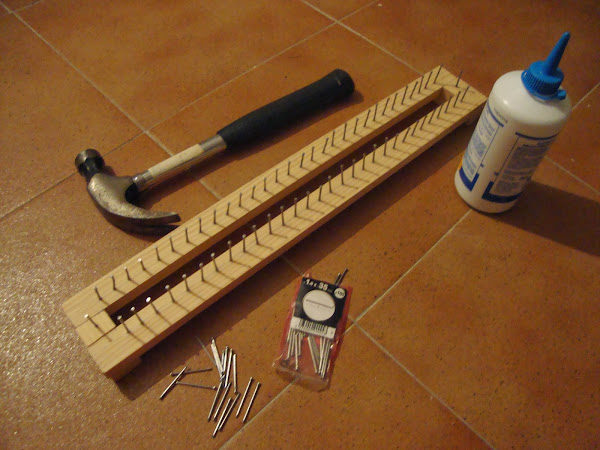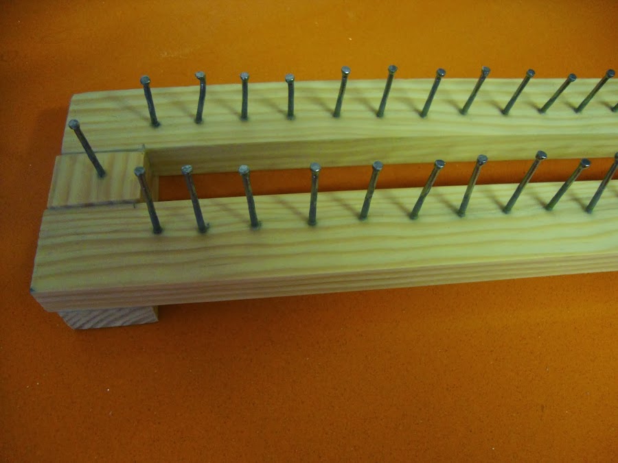 Colocar los clavos es tarea laboriosa (si conseguís ayuda como hice yo, muchísimo mejor), tienen la mala costumbre de torcerse, cuesta que queden alineados, clavarlos justo de la misma altura y evitar que la madera se abra, pero no queda más remedio que clavarlos pues son el propio mecanismo del telar.