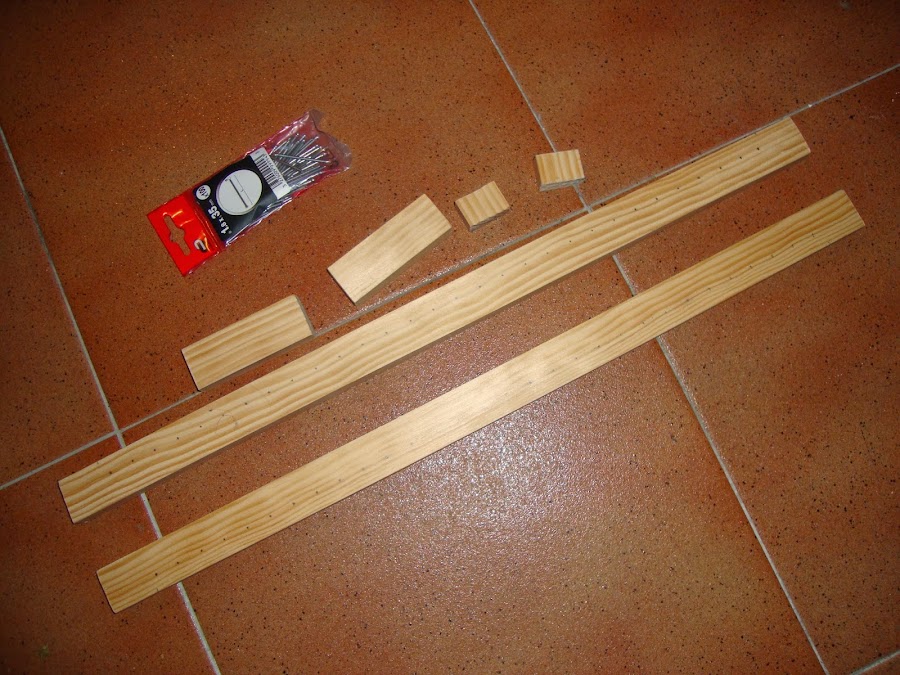 Compramos un listón de madera de pino pulido de 2400 mm de largo, ancho 27 mm, alto14 mm, clavos sin cabeza de 1,8 X 35 mm (se llaman sin cabeza, son los que acaban redondeados para que no se nos enganche la lana al subir el punto) y cola blanca de carpintero.