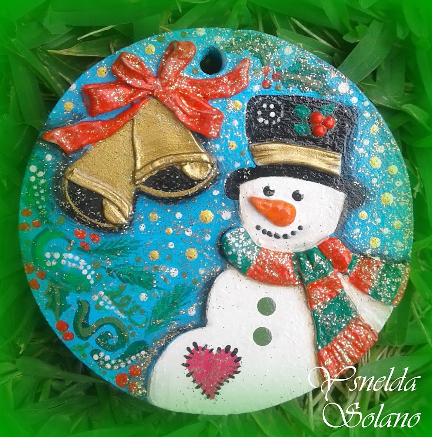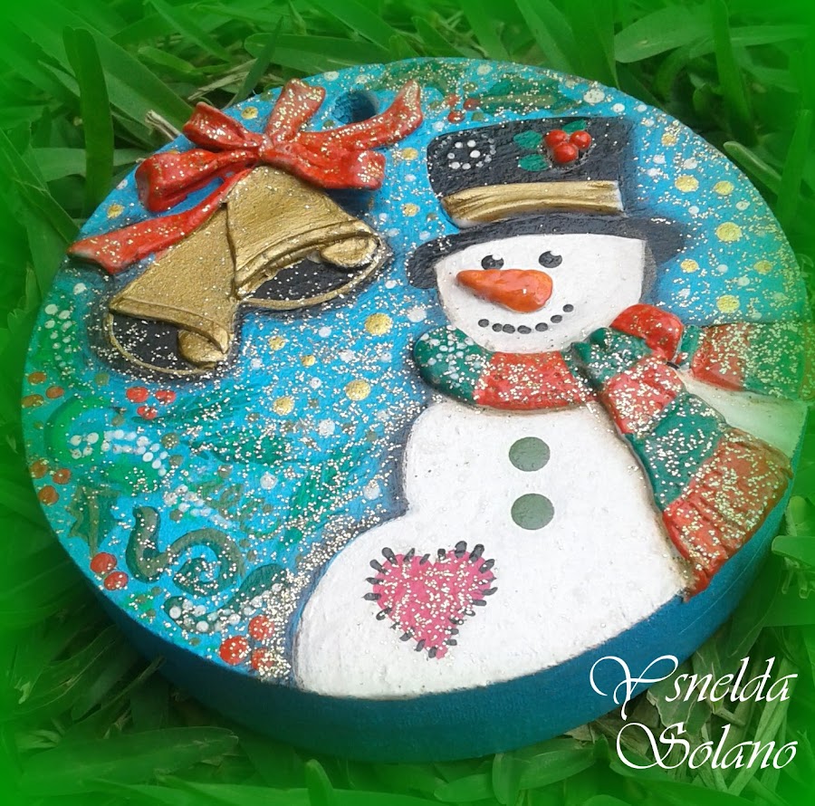 1.- Dibujé sobre las piezas, porque no tenia los patrones o moldes del dibujo: Por ejemplo, a los angelitos en la cabecita les notaba defecto (seguro por eso los desecharon) y el duendecillo lo borre varias veces hasta cuadrar sus orejas (algo deformes) y gorro. Con la pieza circular, si fue mas sencillo, por supuesto hice mi preferido "muñeco de nieve", con unas campanas para acompañar a la amiga Diana en su RMB.