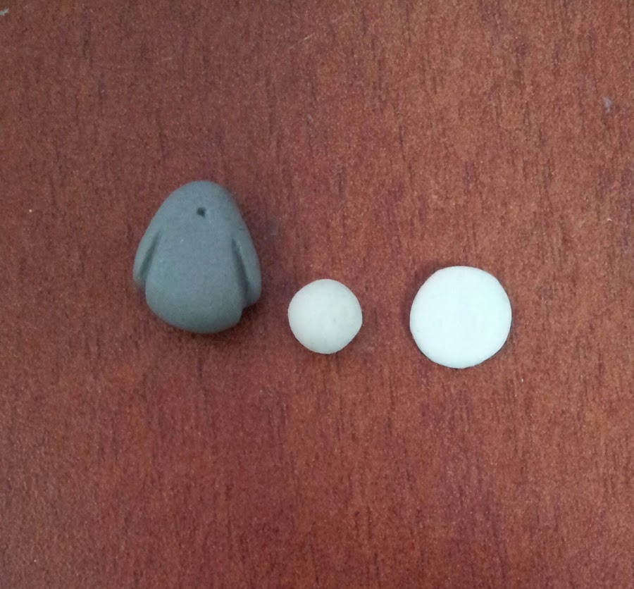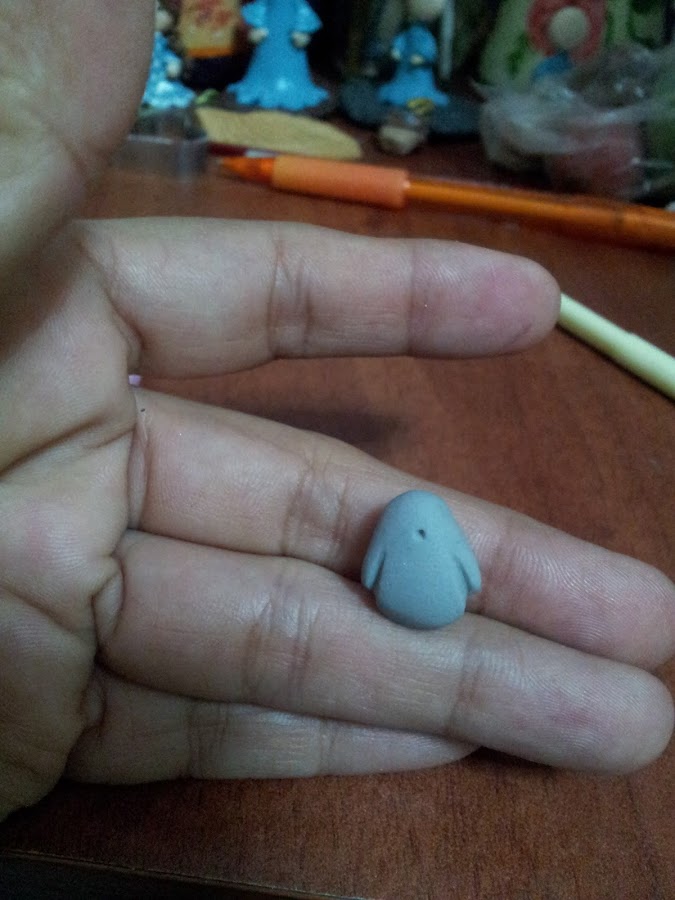 1.- Primero, pintamos una bolita de pasta flexible de color blanco y luego le agregamos unas gotas de negro para obtener gris claro. Con un poquin de masa flexible gris realizamos esta forma oval ⬯ aplanada un poco en la base. Con la esteca marcamos los bracitos de totoro y el puntito de boca.