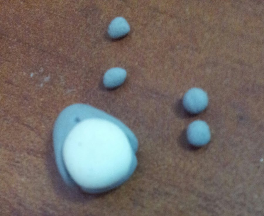 2.- Después colocamos la pancita, que se realiza, a partir de una bolita blanca, que aplanamos. En las fotos no se detalla bien, pero la base gris tiene la barriguita abultada, pues Totoro es "panzoncito".