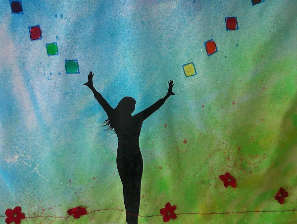 Primero el fondo con sprays (La Pajarita), un poco a lo loco, arrugando la tela para que no quedara igual... dando toques de color verde y amarillo para el campo, rojo a modo de gotas para simular amapolas, y cielo azul.