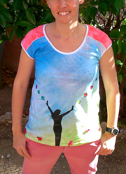 Aquí os descubro lo que puede salir de una camiseta blanca, blanca... con un poco de pintura, rotuladores, vinilo, tela, brillos, tela... pues eso, con un poco de todo.