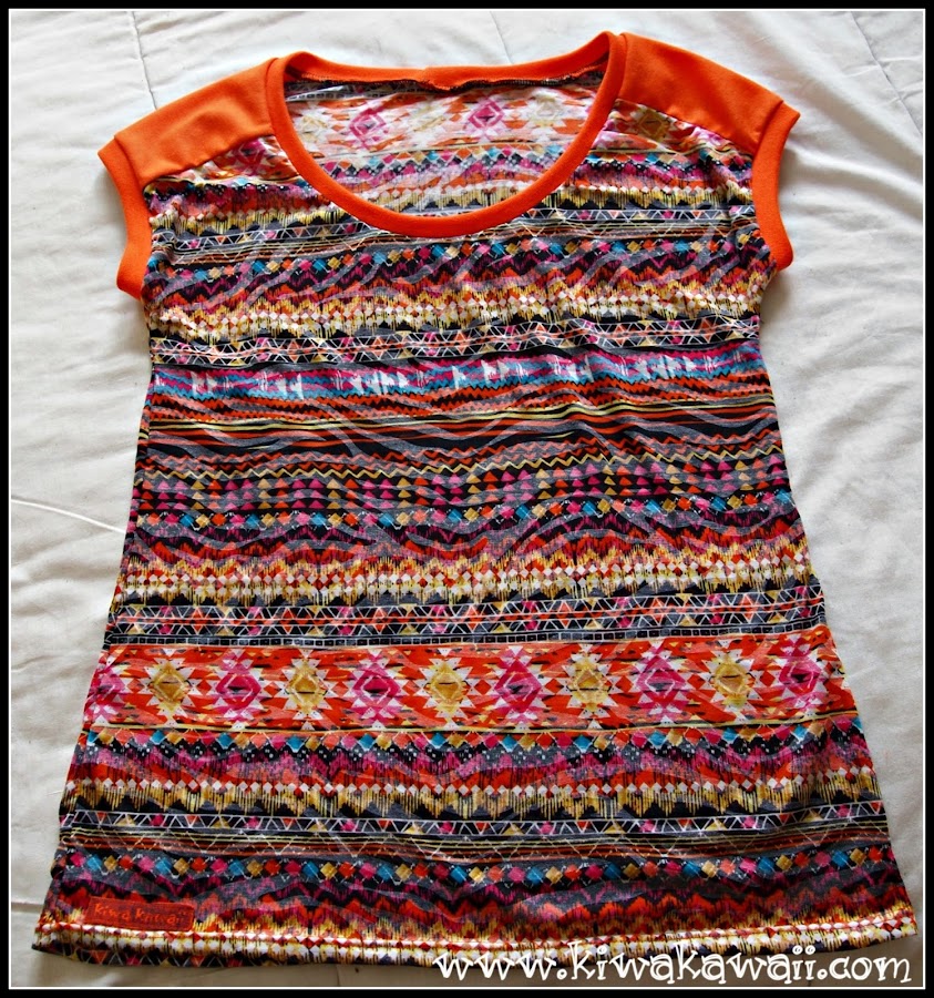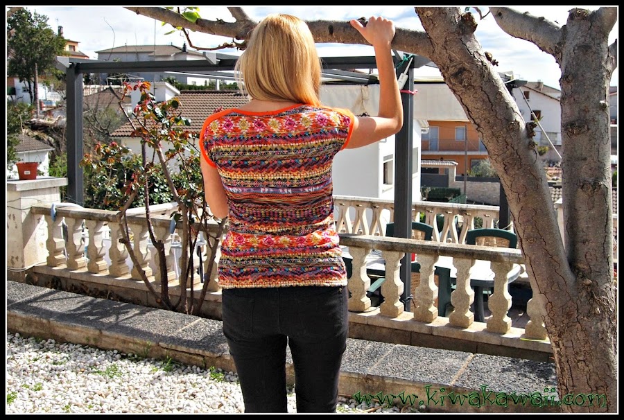 La mía en camiseta de verano finísima... la tela es de Cal Joan y fue amor a primera vista. Me pierde ese estampado geométrico y esos colores tan... tan.... yo! Los canesús con camiseta naranja lisa, a juego con el puño.