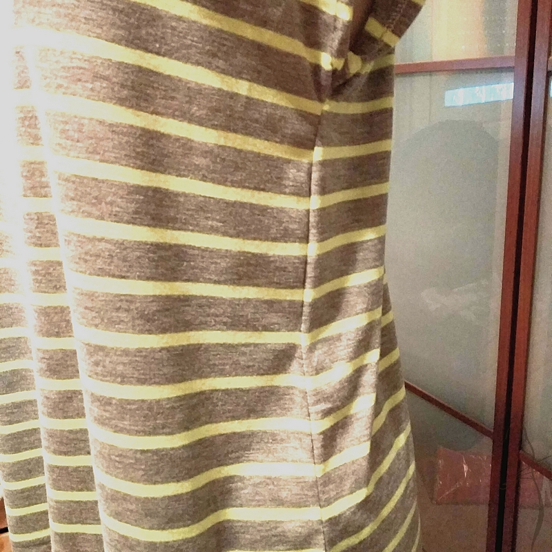 Con una tela de rayas en tonos gris y amarillo flúor suave, de Cal Joan, que es fresquita y suave, cuello con puño y dobladillo sencillo en mangas y bajo.