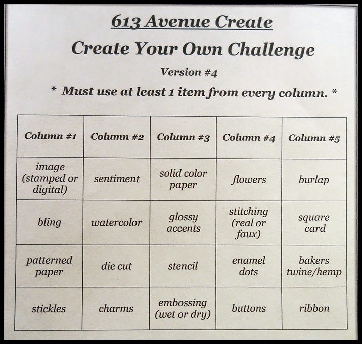 It"s challenge time at 613 Avenue Create. It is challenge #108, Anything Goes with optinal twist Create Your Own Challenge. I have to say that I love this theme, but I find myself trying to make bingo instead of just choosing one item from each column =P.