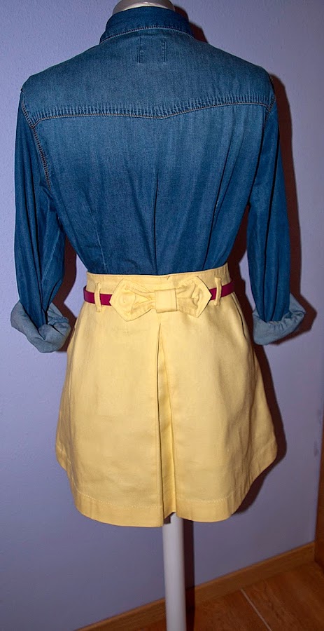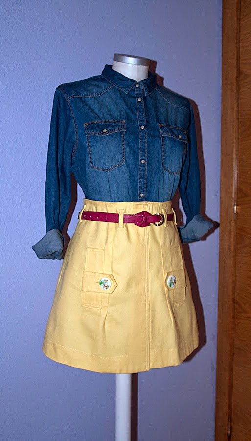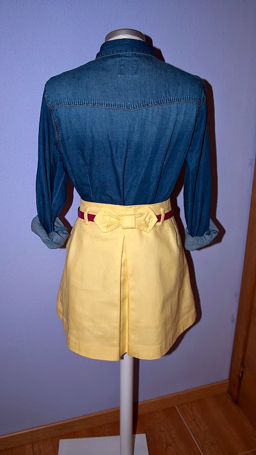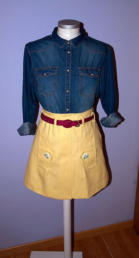 Por fin!! terminada, que ganas tenia de tenerla, hace unos días publique en el Facebook del Taller de Chapucina (por el que podéis pasar y decir que os gusta cuando queráis ;P jejeje) una fotografía, en la que comentaba que había sucumbido a comprar una camisa vaquera, nunca me han llamado la atención pero a fuerza de verlas termine comprándome una, y automáticamente me surgió la necesidad de tener la falda amarilla que contrasta a la perfección con el vaquero...