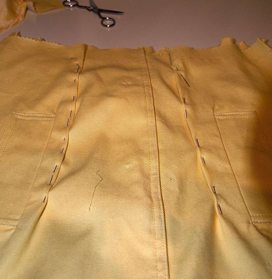 Recorte la parte delantera y la trasera justo por debajo de la sisa, y como la chaqueta tiene el corte en evasé la forma de la falda ya estaba decidida. En la parte delantera cosí las dos partes de la abotonadura una sobre otra.